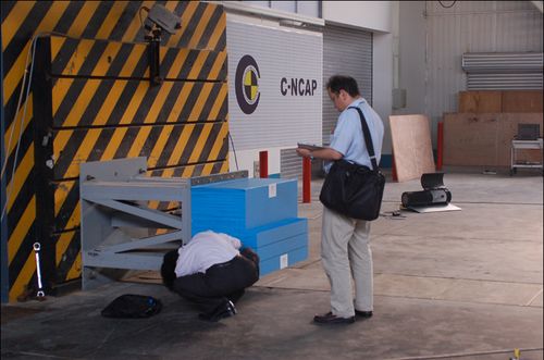 據(jù)中心的相關(guān)負(fù)責(zé)人透露,C-NCAP管理中心今年的試驗(yàn)費(fèi)用將達(dá)到800萬元。這其中將有500萬元用來采購試驗(yàn)車輛。中心對每款車型總共購入3輛,在三天中分別進(jìn)行正面100%重疊剛性壁障碰撞試驗(yàn)、可變性移動(dòng)壁障側(cè)面碰撞試驗(yàn)和正面40%重疊可變性壁障碰撞試驗(yàn)。此番碰撞試驗(yàn)首選東風(fēng)日產(chǎn)出品的騏達(dá)兩廂轎車。在現(xiàn)場,記者看到了多位前來觀看試驗(yàn)的日方代表,廠家方面的技術(shù)人員在現(xiàn)場認(rèn)真的測量紀(jì)錄試驗(yàn)數(shù)據(jù),絲毫不敢怠慢。在試驗(yàn)前,記者還參觀了待撞車輛和假人安放的房間[詳見:碰撞試驗(yàn)室探秘 帶你了解C-NCAP試驗(yàn)],以及試驗(yàn)場內(nèi)許多儀器設(shè)備的功能和使用方法,以后將陸續(xù)作出介紹。除此之外,中國汽車技術(shù)研究中心還在進(jìn)行車輛油耗在內(nèi)的多項(xiàng)試驗(yàn),今后也有可能對外公開數(shù)據(jù)。  廠方工作人員記錄數(shù)據(jù)