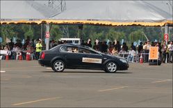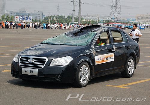 經(jīng)現(xiàn)場工作人員將車體翻過來后,這輛車照常可以開動。近前觀察,這輛“奔騰”轎車的頂棚和B柱由于翻滾時受力較大,出現(xiàn)變形或向內(nèi)凹陷。前風擋玻璃粉碎,但仍舊保持完整。從現(xiàn)場的情況看,副駕駛席頭部位置受到了較大影響,天窗結(jié)構(gòu)在車頂?shù)淖冃沃衅鹆瞬缓玫淖饔谩5氨简v”加強的B柱表現(xiàn)出良好的韌性,阻止了車頂部的塌陷繼續(xù)向后蔓延,為副駕駛留出了一定的生存和逃生的空間。隨著駕駛員面帶微笑的推開車門,走出來向人群揮手示意,現(xiàn)場的工作人員宣布此次真人實車側(cè)翻試驗完全成功。相信在現(xiàn)實情況下,奔騰轎車堅固的3H車體以及特別加強的A、B柱,加上氣簾,側(cè)氣囊等電子安全配置的介入,將為乘員提供更好的保護。