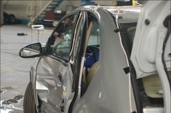 現場可以看到,在受到撞擊后,雅紳特的側面前后車門已經嚴重凹陷。而后門的上部則脫離開了車體框架,張開一個大口(騏達和307基本如此),但四個車門依舊牢牢的鎖住沒有被打開。底梁和中柱出現變形,頂梁則有輕微的凹陷,但幅度都不大,基本上抵御住了來自側面的沖擊。打開另一側車門觀察內部,也未有什么異常,假人坐姿非常端正,并沒有倒向一邊。 |