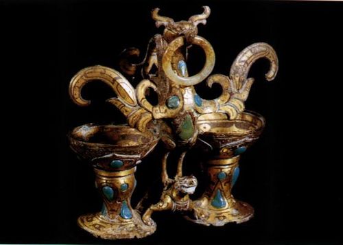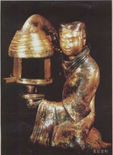 竇墓和劉墓大體相同,體積為3,000立方米,外口是在兩道磚墻之間,灌以鐵水封閉,比劉墓更為堅固嚴密,其庫房和車馬房亦比劉墓為大。兩墓出土金、銀、銅、鐵、玉、石、陶、漆等器物,絲織品、銀鳥篆壺和醫用金針共一萬多件。其中有:長信宮燈,高48厘米,通體鍍金,作宮女跪坐執燈狀,可調節燈光的照度和照射的方向,燭燃煙灰可溶體內,又可以拆開各部便于清洗,燈上刻銘文六十五字。錯金博山爐,是一種熏爐,高26厘米,通體用金絲錯出精致的紋飾。把香料放入點燃,香煙通過爐蓋的許多小孔,裊裊上升,彌漫房中,爐蓋高而尖,鑄成山巒重選之形,以象征海中博山,故稱博山爐,工藝之精湛,舉世罕見。還有墓主人的兩套完整的金縷玉衣葬服,是首次重大發現。衣用玉片制成,玉片間以金絲編綴。劉的玉衣長1.88米,用玉片2,498塊,金絲約1,100克,分頭、上衣、褲、手套和鞍五部分。竇的玉衣長1.72米,用玉片2,160塊,金絲約600克,結構相同。
