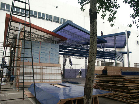 本來挺寬廣正門廣場成了室外展臺和貨柜的天下